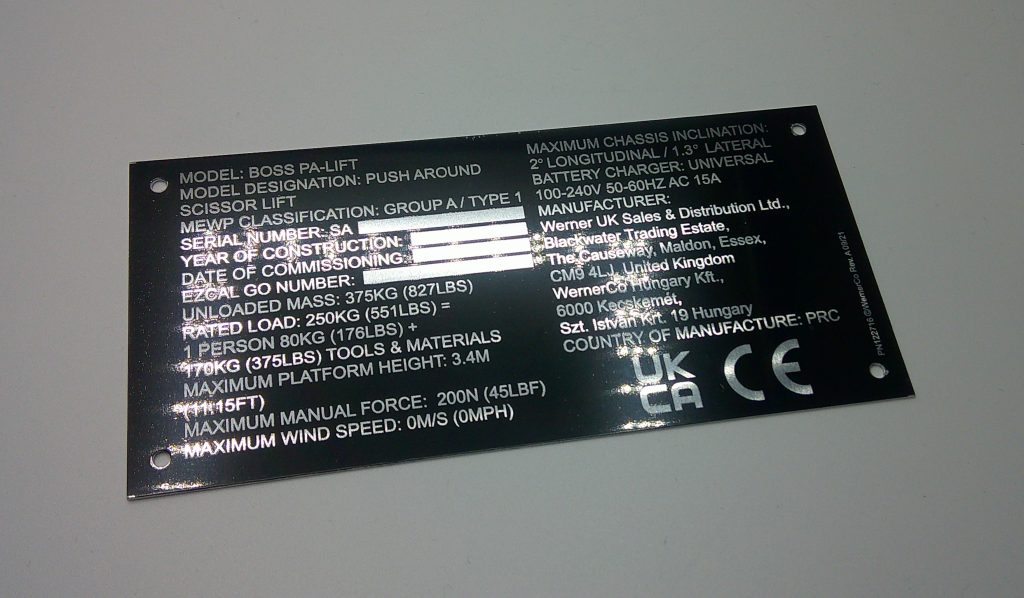 BoSS PA-lift manufacturer’s plate
