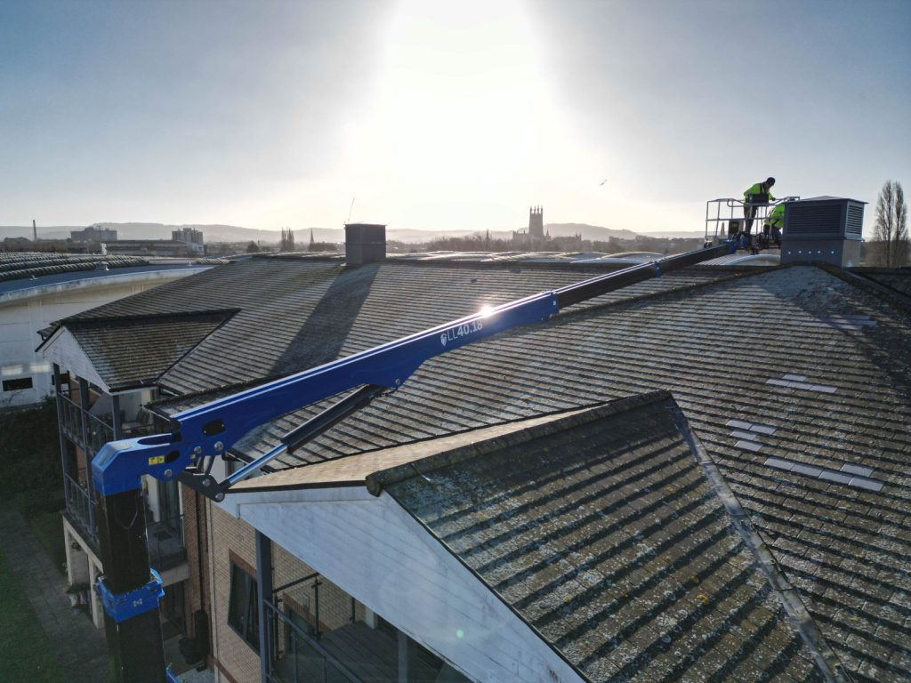 The Fletcher Access team used the spider lift’s full 17.5m reach to boom to the centre of the roof of the Gloucester care home, allowing operatives to fix the cupola in place after it had been lifted in by a mobile crane.