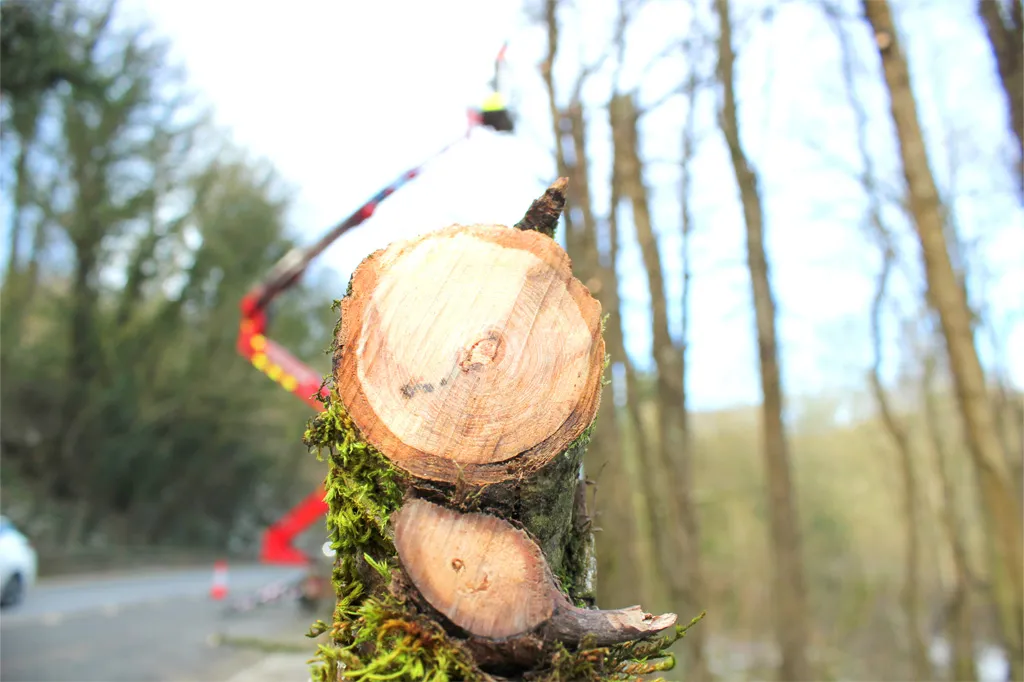 An ash tree infected with ash dieback – the tree surgeon was using a Hinowa Lightlift 20.10 Performance IIIS spider cherry picker to work safely to fell the trees next to a main road near Matlock Bath, Derbyshire.