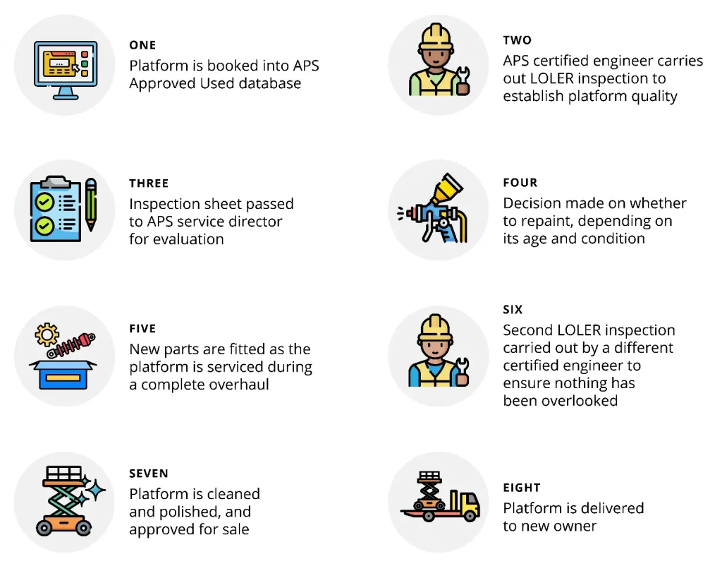 Talk to APS about options for buying Approved Used platforms. TTelephone: 01480 891251. Email: sales@accessplatforms.co.uk.