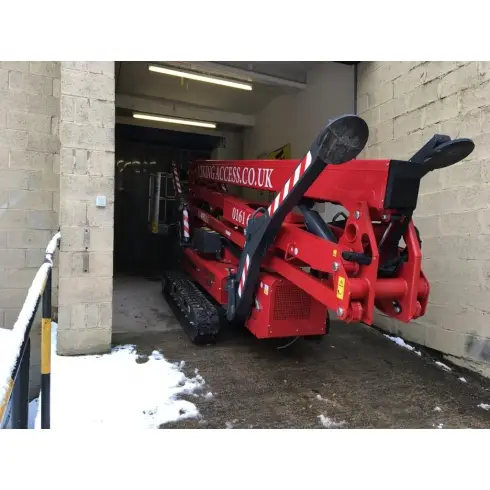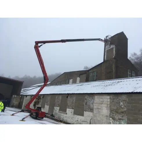 B&E Boys Ltd, based in the Rossendale valley in Lancashire, required an access platform in order to erect a sign, do some pointing, and inspect some guttering at a former mill. The task required 14 metres of outreach at 15m height to reach a chimney – and in order to reach the job site, the machine had to climb two ramps and pass through an opening just 3m high. The access platform also had to be dual fuel, so that it could work in and around the building.